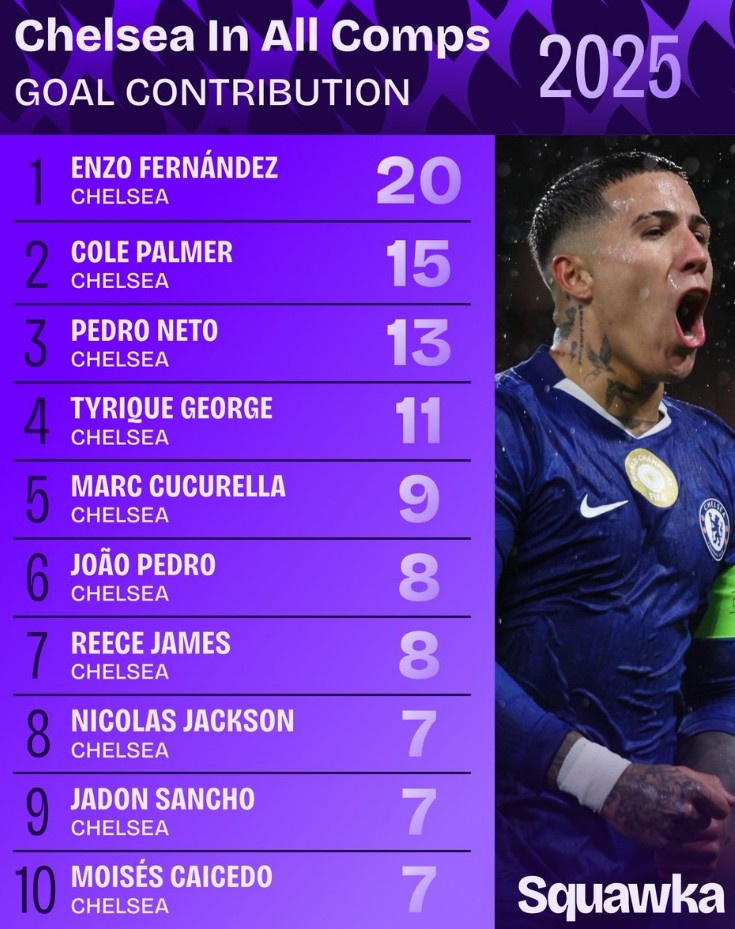 切尔西2025年各项赛事参与进球榜:恩佐20球居首,帕尔默次席