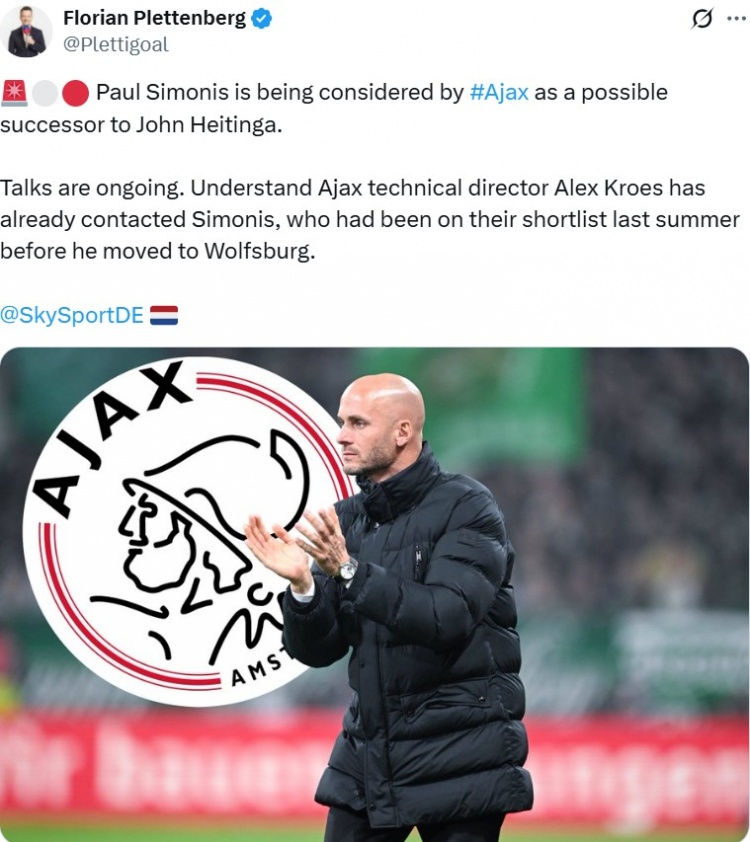 报道称双方谈判正在进行中,阿贾克斯的技术总监亚历克斯-克罗斯已经联系了西蒙尼斯。去年夏天,西蒙尼斯曾是阿贾克斯选帅的目标之一,但最终他选择了加盟沃尔夫斯堡。